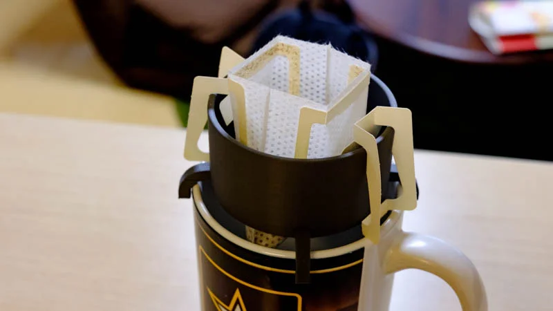 嵩上げされているので、ドリップパックの下端はカップのふち近くまでしか垂れ下がりません。もっと小さいコーヒーカップであっても、これなら淹れてる最中にパックの下が湯に浸かってしまうなんてことはありません。