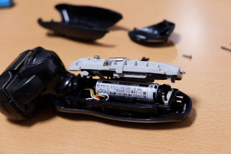 これでグレーのカバーも外れて、中の充電池さんが見えました。ただ、カバーは中の配線とつながっているので完全にはとれません。