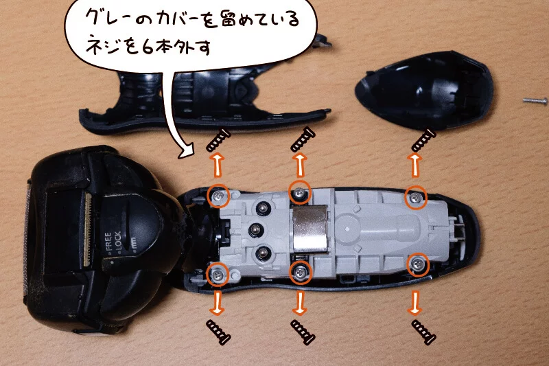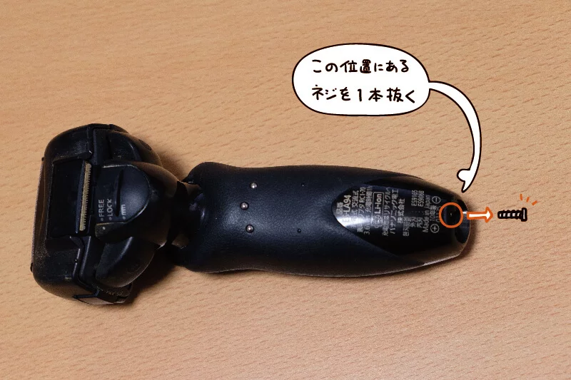 さて、それでは分解のお時間です。特に説明書とかはありませんが、なんとなくそれっぽいとこに見えてるネジを抜いていけば多分いけるでしょーってことで、シェーバーをジロジロと見回して、まずは唯一見えてるお尻の方のネジを1本抜いてやります。