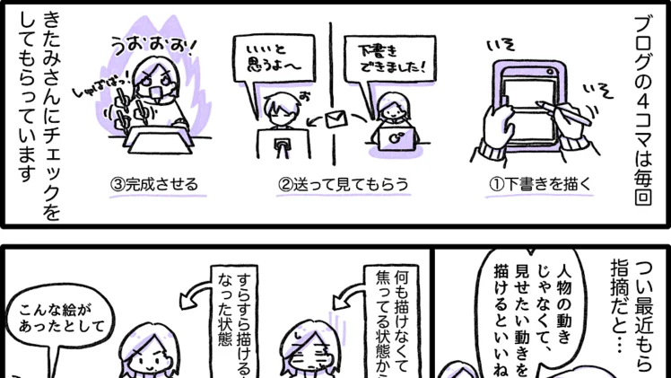 一番に見せたい動きは何か?を意識して、それに当てはまるイラストを描くことが大事ということを教わりました。なので、気持ちの変化を見せたいなら人物の動きを見せる、状態の変化を見せたいなら状態の変化を見せるという感じです。この指摘を受けて、つ...