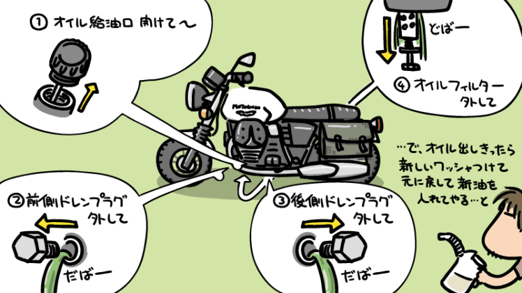 昨日の記事で情報もまとめ終わったことだし、まずはエンジンオイル交換の顛末から作業メモをまとめたいと思います。といっても、上のイラストの通りにやるだけのことなので、なんてことはない作業…のはずが、意外と手間取りました。この日はエンジンオイル...